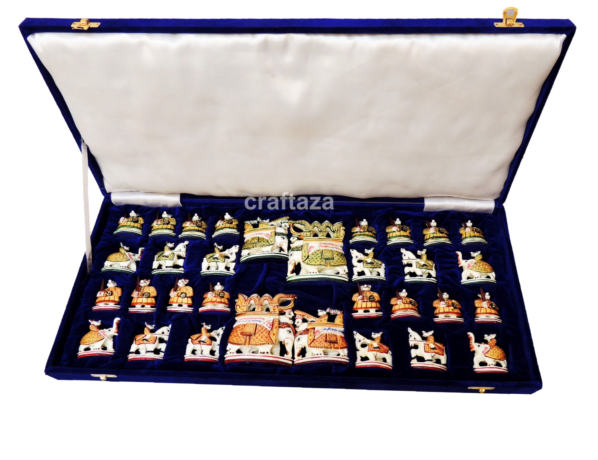 This wooden Indian Maharaja Chess set includes 32 Maharaja style chess pieces and one stylish chess box. It is a hand-polished, handcrafted, and beautiful chess set.